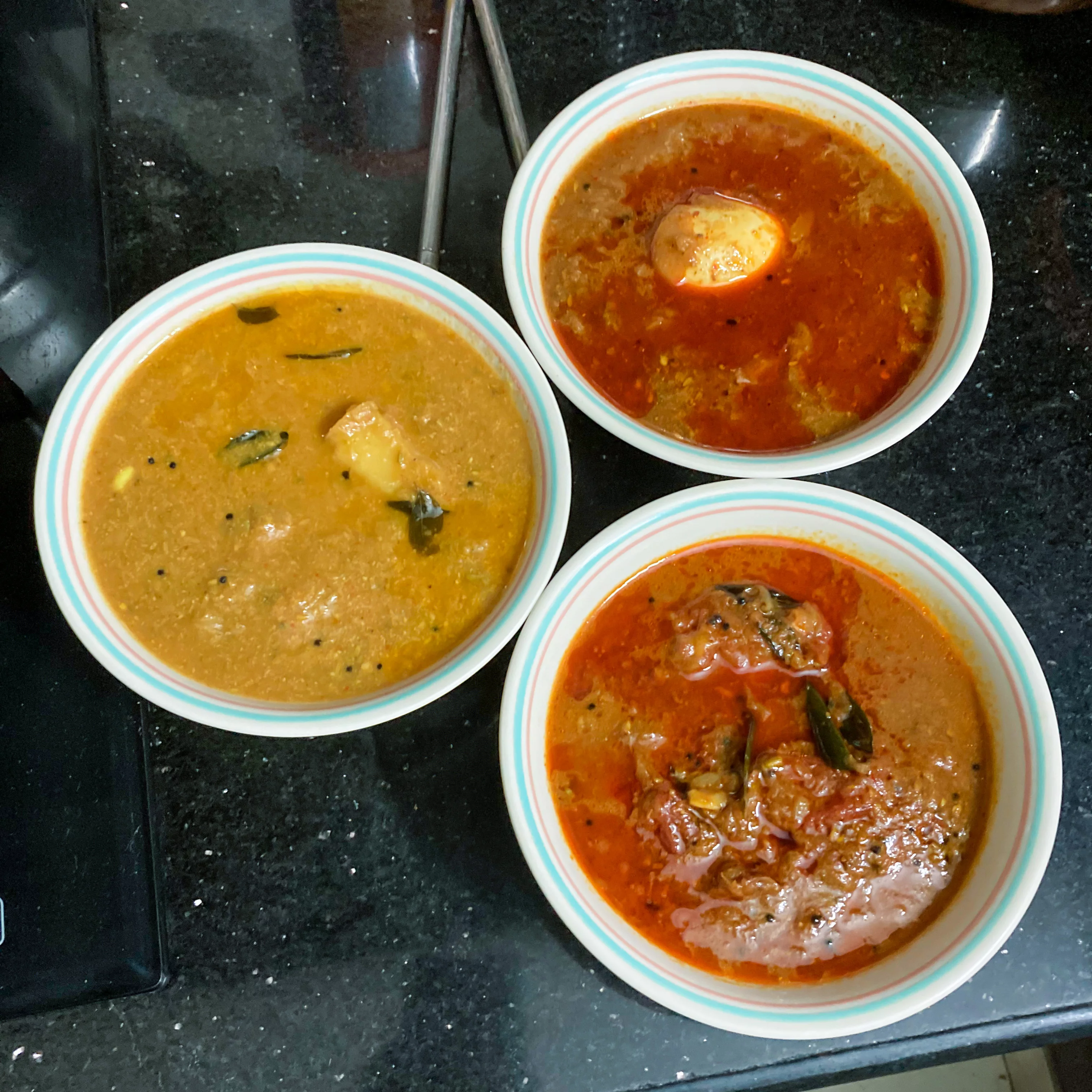 Now coming to the curries, as I said before, we had all 3 curries that were available today morning which were the Mutta Curry which is basically the Egg Curry, the Thakkali Curry, which is the Tomato Curry and the Kizhangu Curry which even though Kizhangu is an umbrella term for all tuber crops in Malayalam, was essentially a Potato Curry that we got… The Mutta Curry was my favourite from the bunch simply because unlike the other places, its not just the Onion Gravy topped with boiled egg… Instead, here they use the same recipe for the masala that they use for their Chicken Curry and also, the gravy does have a nice flavour of the Egg itself along with the taste of the nice spicy and savoury gravy made with the classic caramelised onion, tomato, green chillies, turmeric, chilly powder, coriander powder, garam masala, Curry Leaves, Garlic, Ginger and Coconut oil… The Thakkali Curry appeared to be made using the same recipe but with lesser Garam Masala and it had the sweet and slightly sour taste of the extra Tomatoes, Onions and Garlic added as well making it a Sweet, Spicy and slightly sour curry to have… The Kizhangu Curry was different as in it did have the Same garam masala but instead of making it an onion-tomato based gravy, this was based on ground Coconut and hence had a bit more richness to it, coming from the Coconut… It also appeared to have some pieces of roasted Coconut as well and of-course everything was cooked using Coconut oil and so ultimately the fragrance of Coconut was taking the lead for that one… All the 3 curries appeared to work great with the Porotta as well the Appam, though personally, I prefer the Porotta over Appam any day… 🙂