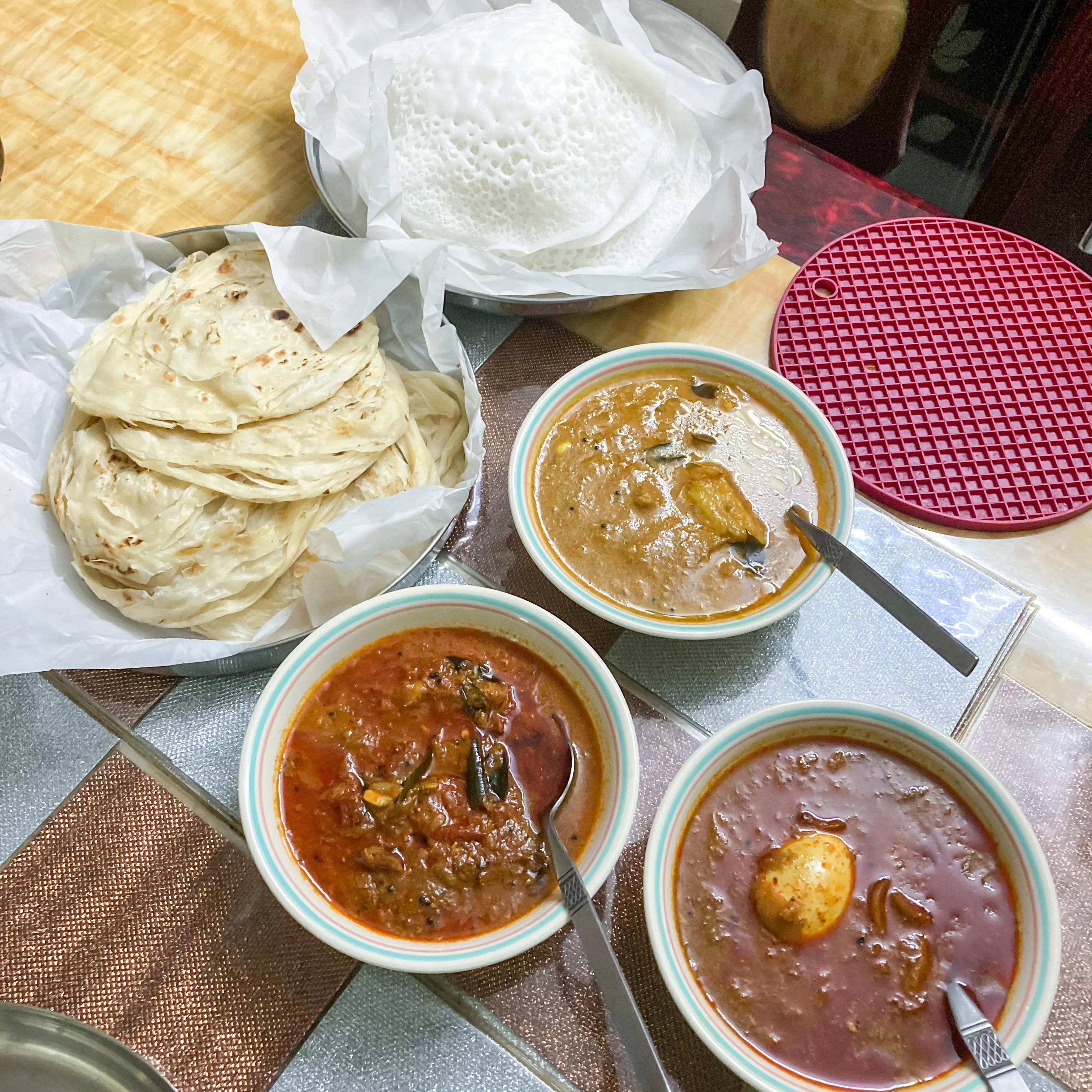 So, the pics shown below show the food we got today and this is typically what you get when you go there early in the morning… What we had today to eat were Porotta and Appam and along with them 3 curries namely, the Mutta Curry, Thakkali Curry and Kizhangu Curry… These are pretty the local staple food items in the area which is common to pretty much all local eateries here for breakfast… Of-course there is also the Dosa and Idiyappam as well (they keep rotating) but the curries tend to be the same everyday during the early hours… Rest of the menu, comes available later in the day… I think places like these are interested cause their pricing is essentially affordable to all and the food tends to be simple and basic (explains the pricing as to work within that, they can’t afford the shortcuts) and hence have that homemade feel as opposed to being “hotel food”…